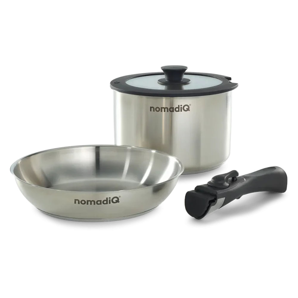 NOMADIQ-COOK | NomadiQ Cookware Set Discover premium cooking on the go with the nomadiQ Premium Stainless Steel Cookware Set: the durable cookware set for camping outdoor cooking and any adventurous meal. Thanks to its high-quality 3-layer clad construction with an aluminum core heat is distributed quickly and evenly for perfect results with every dish. Crafted from premium 304 stainless steel this set is rust- and stain-resistantbuilt to last. It includes a 24cm stainless steel skillet and a 3.5L saucepan with a silicone/glass lid. The removable handle provides a secure grip and makes it easy to move from stovetop to table. Oven-safe to 500°F/260°C and dishwasher-safe. Suitable for gas ceramic/glass and induction cooktops it s compatible with the nomadiQ Stove and can also be used on the nomadiQ BBQ. Includes a convenient carrying case so you can cook like a true chef anywhere! HIGH-QUALITY STAINLESS STEEL THAT LASTS Made with premium stainless steel this cookware set offers exceptional resistance to rust and stains. REVOLUTIONARY PERFORMANCE The 3-layer clad construction features an aluminum core covered by 304 stainless steel. Providing exceptional heat conduction and consistent cooking every time. SAFE AND COMFORTABLE TO USE Detachable secure grip even when pots are full. Feel confidence while lifting pouring and transferring from stove to table. OVEN AND DISHWASHER SAFE Designed for everyday use the pot and skillet are oven-safe up to 500°F/260°C and works on all cooktops including induction. Weight: 2kg