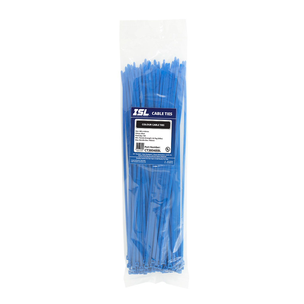 380 X 4.8MM NYLON CABLE TIE BLUE Minimum Tensile Strength: 22.7kg / 225N / 50lb Max. Bundle Dia.: 102mm / 4.01in Technical Spec: Material: Polymide 6.6 (PA66) Operating Temp: -40°C to +85°C Flamability: UL94 V2 UL Approved – E243263