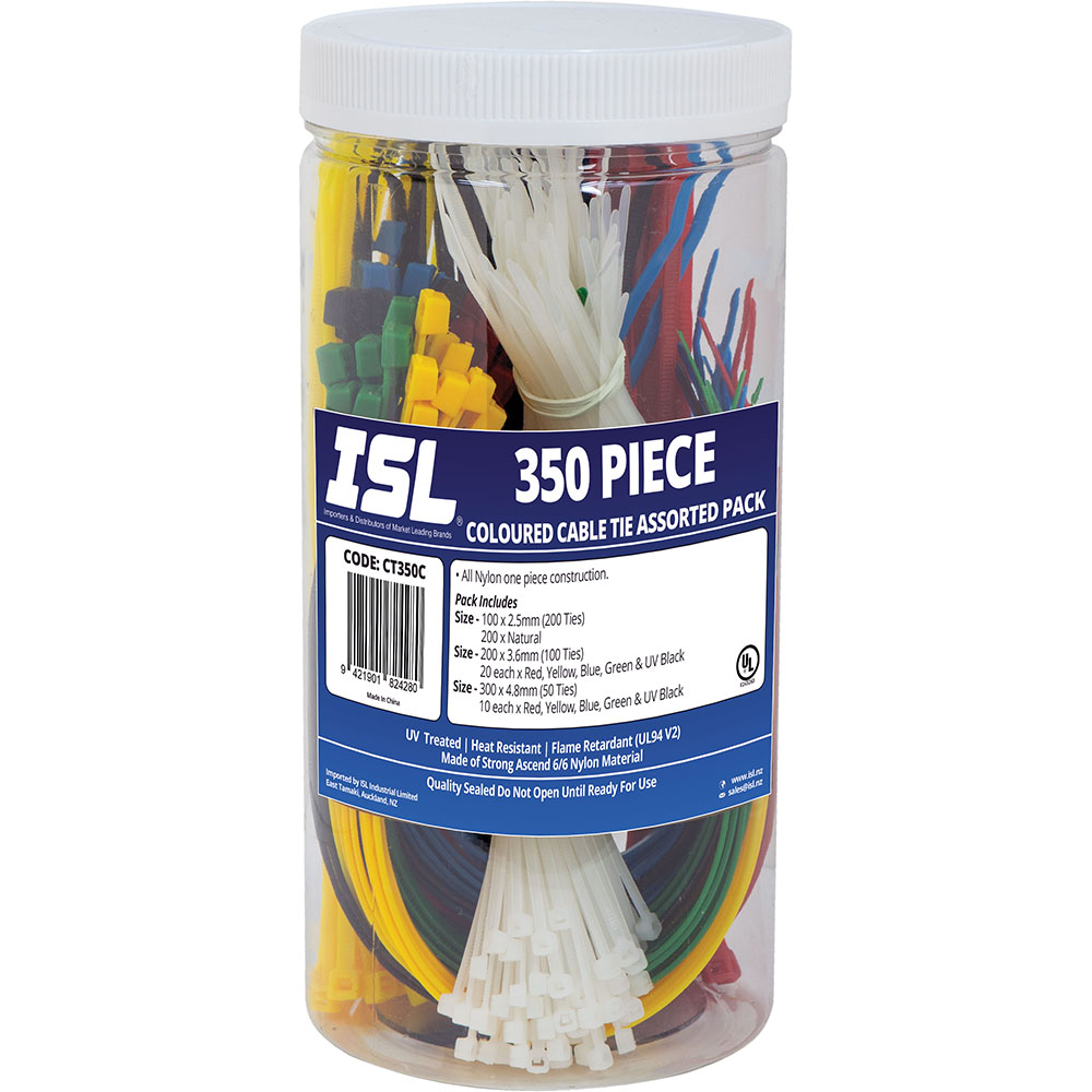 CT350C – Coloured Cable Tie Assortment Pack All Nylon one piece construction. Size: 100 X 2.5mm (200 ties) – 200 x Natural Size: 200 x 3.6mm (100 ties) – 20 each x Red Yellow Blue Green & UV Black Size: 300 x 4.8mm (50 ties) – 10 each x Red Yellow Blue Green & UV Black UL Approved.