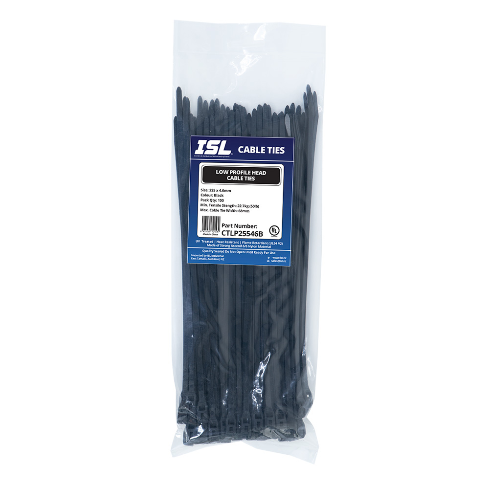 CTLP25546B – 255mm x 4.6mm Low Profile Head Cable Tie UV BLACK Minimum Tensile Strength: 22.7kg / 225N / 50lb Max. Bundle Dia.: 68mm / 2.67in Snag-proof contour has no barbs or spikes to injure an installer technician or user. Use whenever a safe visually-appealing low-profile head cable tie is needed. Ideal applications include wire harnesses confined spaces control panels marine hoses playgrounds construction appliances and safety equipment. Technical Spec: Material: Polymide 6.6 (PA66) Operating Temp: -40°C to +85°C Flamability: UL94 V-2 UL Approved – E243263