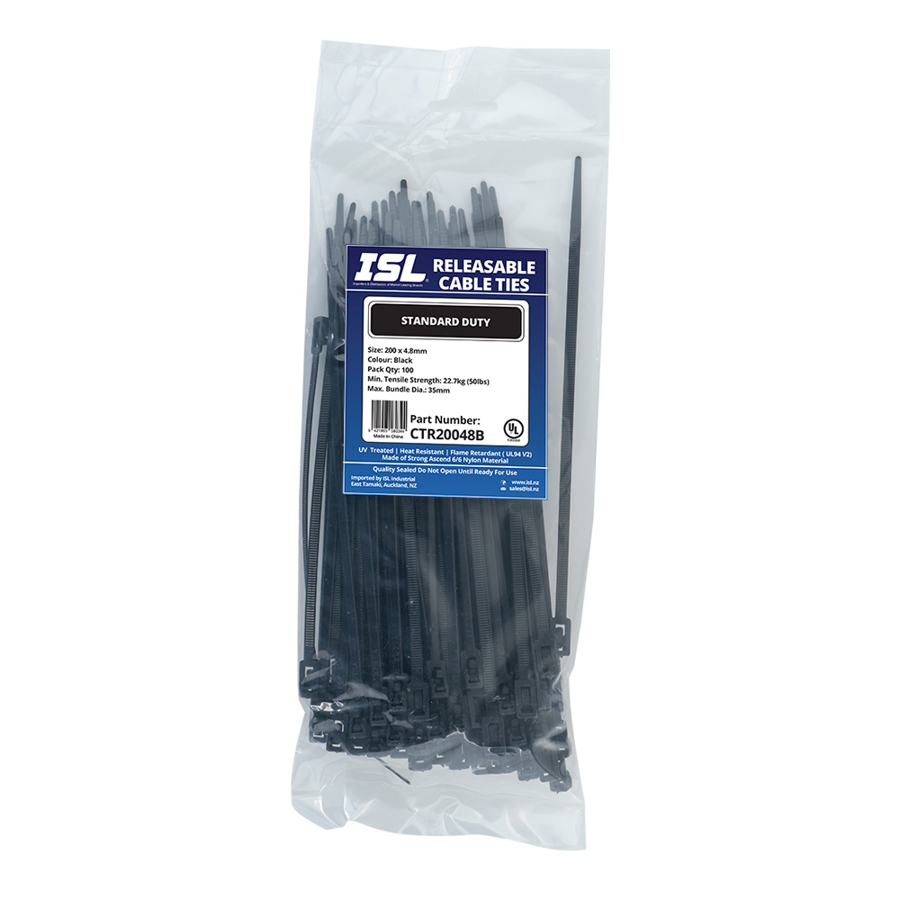 200 X 4.8MM UV NYLON RELEASABLE CABLE TIE UV BLACK – RELEASABLE Minimum Tensile Strength: 22.7kg / 225N / 50lb Max. Bundle Dia.: 35mm / 1-3/8in Technical Spec: Material: Polymide 6.6 (PA66) Operating Temp: -40°C to +85°C Flamability: UL94 V2 UL Approved – E243263