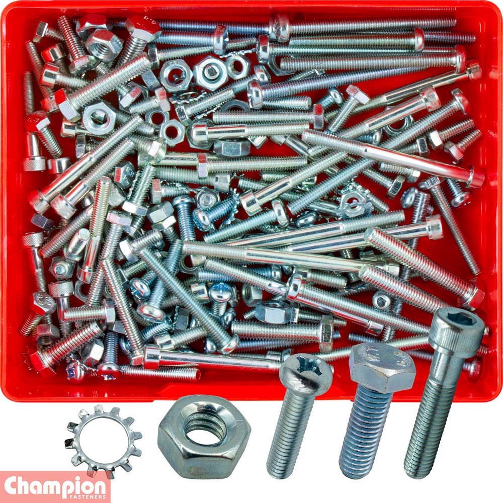 CA302 – 191PC MOTORCYCLE FASTENERS ASSORTMENT Metric Socket Head Cap Machine and Hex Screws and Star Washers. Zinc Plated. 28 Sizes 191 Pieces Replacement Packs Are Not Available Assortment Contents Listed Below Part # Size Pack Qty ESW4 1/4 Ext. Star Washers 20 ESW5 5/16 Ext. Star Washers 10 M8406016 M6 x 16 Pan x Rec Screws 5 M8406020 M6 x 20 Pan x Rec Screws 5 M8406030 M6 x 30 Pan x Rec Screws 5 M8406040 M6 x 40 Pan x Rec Screws 5 M8406050 M6 x 50 Pan x Rec Screws 5 M8406070 M6 x 70 Pan x Rec Screws 5 M8406080 M6 x 80 Pan x Rec Screws 5 M91206010 M6 x 10 Socket Hd Cap Screw 5 M91206016 M6 x 16 Socket Hd Cap Screw 5 M91206020 M6 x 20 Socket Hd Cap Screw 5 M91206025 M6 x 25 Socket Hd Cap Screw 5 M91206035 M6 x 35 Socket Hd Cap Screw 5 M91206040 M6 x 40 Socket Hd Cap Screw 3 M91206050 M6 x 50 Socket Hd Cap Screw 3 M91206060 M6 x 60 Socket Hd Cap Screw 3 M91206070 M6 x 70 Socket Hd Cap Screw 3 M91206080 M6 x 80 Socket Hd Cap Screw 3 M933060012 6 x 12mm GR8.8 Set Screws 10 M933060016 6 x 16mm GR8.8 Set Screws 10 M933060020 6 x 20mm GR8.8 Set Screws 10 M933060040 6 x 40mm GR8.8 Set Screws 10 M933080025 8 x 25mm GR8.8 Set Screws 2 M933080035 8 x 35mm GR8.8 Set Screws 2 M933080050 8 x 50mm GR8.8 Set Screws 2 M93406100 M6 x 1.00 Metric Hex Nuts 20 M93408125 M8 x 1.25 Metric Hex Nuts 20