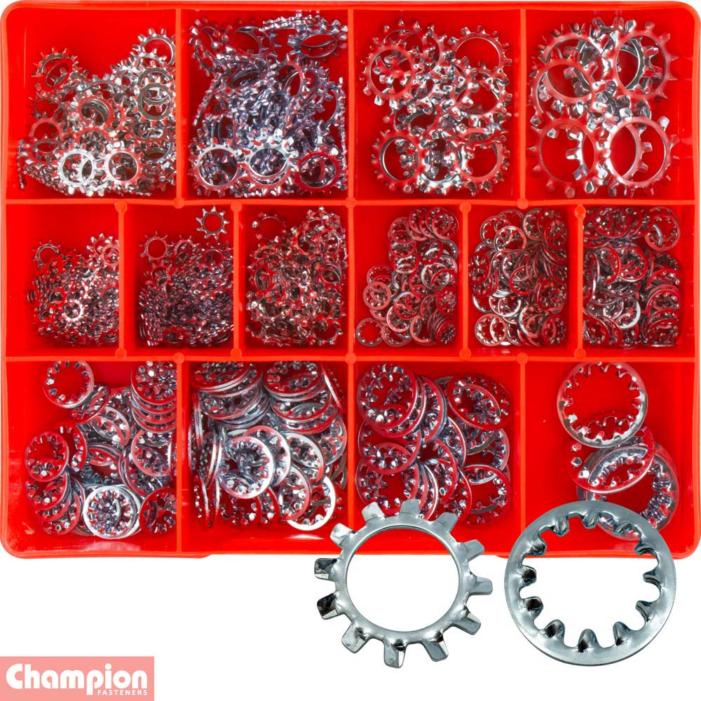 CA1780 – 560PC STAR WASHER ASSORTMENT Internal and External Zinc Plated. 14 Sizes: 4mm to 16mm 560 Pieces Replacement Packs Available Part # Size Pack Qty C1780-1 4mm External 50 C1780-2 5mm External 50 C1780-3 6mm External 50 C1780-4 8mm External 50 C1780-5 10mm External 50 C1780-6 12mm External 20 C1780-7 16mm External 10 C1780-8 4mm Internal 50 C1780-9 5mm Internal 50 C1780-10 6mm Internal 50 C1780-11 8mm Internal 50 C1780-12 10mm Internal 50 C1780-13 12mm Internal 20 C1780-14 16mm Internal 10