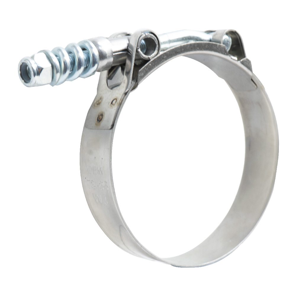 TBS19117886W2 | Kale T-Bolt With Spring W2 78-86 mm Spring loaded providing constant tension clamp designed for sealing pressure and vibrating joints suited to medium and heavy-duty applications. Perfect solution for silicone hoses or applications subject to high pressure and temperature such as turbo hoses. Specifications High tensile strength Rolled band edges Uniform clamping force 3 point welding Space saving design with hammer head bolt Full stainless 304 band Nylon lock nuts. Band Width / Hex: 19/11 mm Diameter Range: 78-86 mm