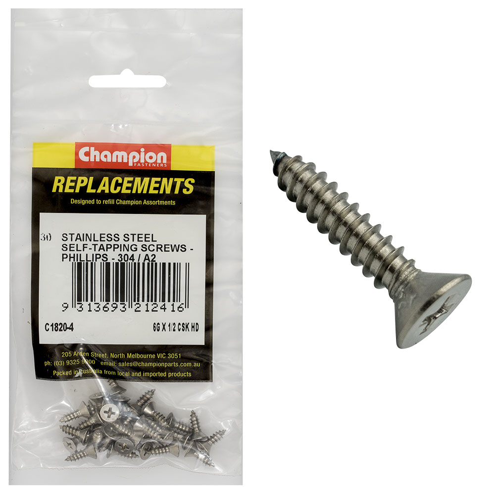Champion 6G x 1/2 S/Tappg Screw Csk Hd Phillips 304/A2 -30pk
