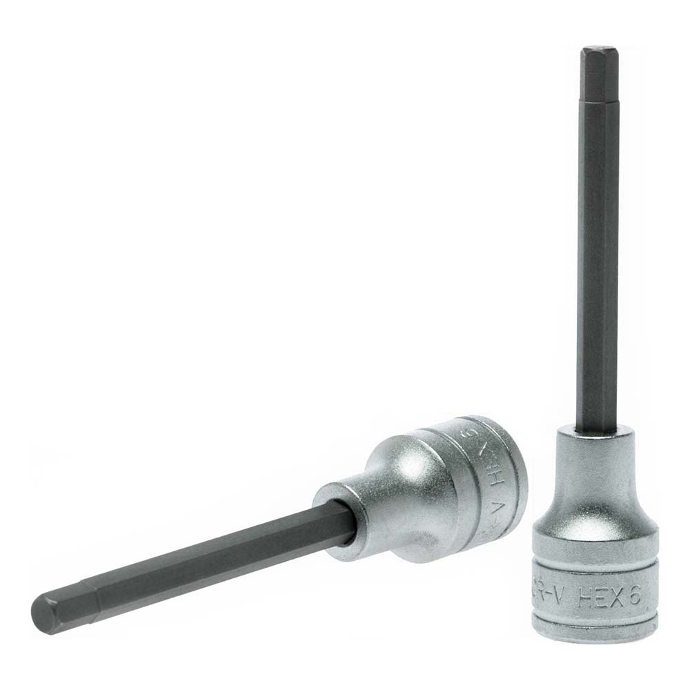 1/2 Inch Drive Hex Bit Socket Long sockets for internal hex holes. For hand tightening. Chrome vanadium steel. Satin finish. Size: 6mm Length: 100mm