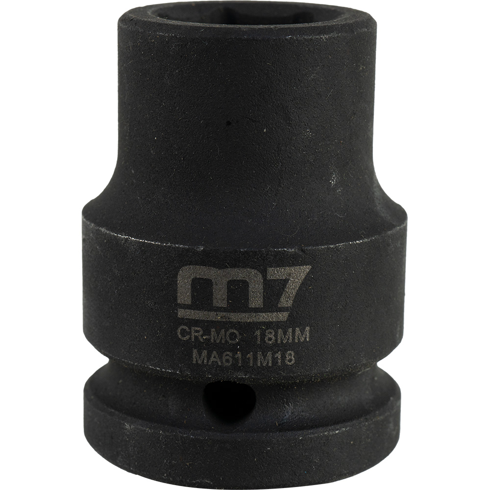 M7-MA611M18 | M7 Impact Socket 3/4in Dr. 18mm Specifications Drive: 3/4 Diameter: 18mm Depth: 10.2mm Overall Length: 50mm