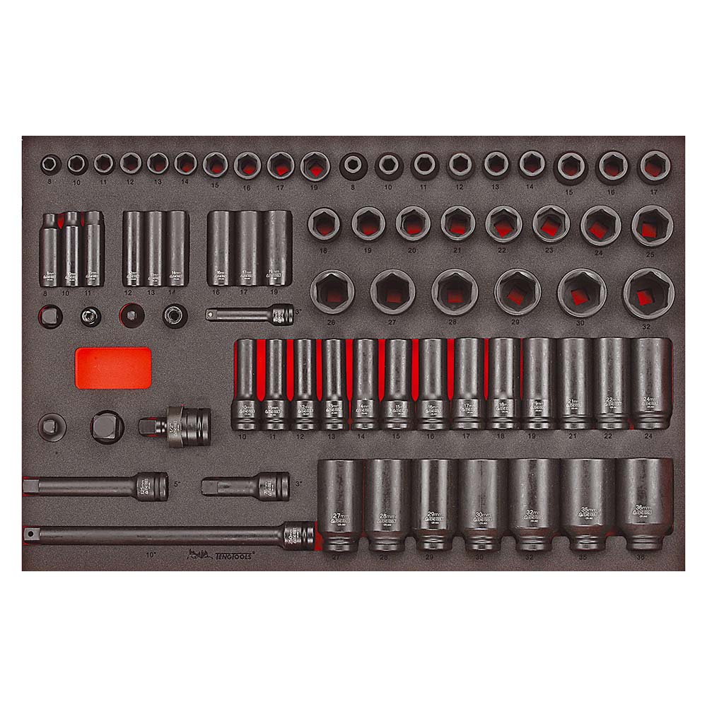 TTEISK73 – 73pc 3/8in & 1/2in Drive Impact Socket & Accessory Set EVA TC-Tray Modular System – GET ORGANISED WITH TENG! Tray Size: 570 x 375 x 75mm Tray Weight: 12.34kg Supplied in Teng Tools recessed two colour EVA foam tray. Fits in Teng Tools tool boxes and roller cabinets. Set Contents: Adaptors: 3/8F-1/4M 3/8F-1/2M 1/2F-3/8M & 1/2F-3/4M Bit socket for 1/4in hex bits: 3/8in & 1/2in Extension bars 3/8in: 75mm (swivel) Std sockets 3/8in 6-pnt: 8 10 11 12 13 14 15 16 17 & 19mm Deep sockets 3/8in 6-pnt: 8 10 11 12 13 14 16 17 & 19mm Extension bars 1/2in: 75 125 250mm Universal joint: 1/2in Std sockets 1/2in 6-pnt: 8 10 11 12 13 14 15 16 17 18 19 20 21 22 23 24 25 26 27 28 29 30 & 32mm Deep sockets 1/2in 6-pnt: 10 11 12 13 14 15 16 17 18 19 21 22 24 27 28 29 30 32 35 & 36mm Retaining rings No: O92416 O935202 O93528 O93525 Retaining pins No: P902515 P90320 P90328 P90324