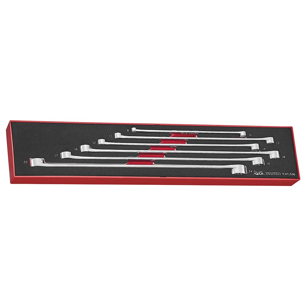 Teng 6 Piece Long Ring Spanner Set -TEX-Tray TC-Tray Modular System – GET ORGANISED WITH TENG! Tray Size: 560 x 110 x 40mm Extra long double ring flat spanner set. With different size 12 point sockets at each end. Chrome Vanadium steel. Three colour EVA foam. Supplied in TEX tray suitable for Teng Tools tool boxes and roller cabinets. Set Contents: 630810FL – 8 x 10mm 631113FL – 11 x 13mm 631214FL – 12 x 14mm 631618FL – 16 x 18mm 631719FL – 17 x 19mm 632224FL – 22 x 24mm