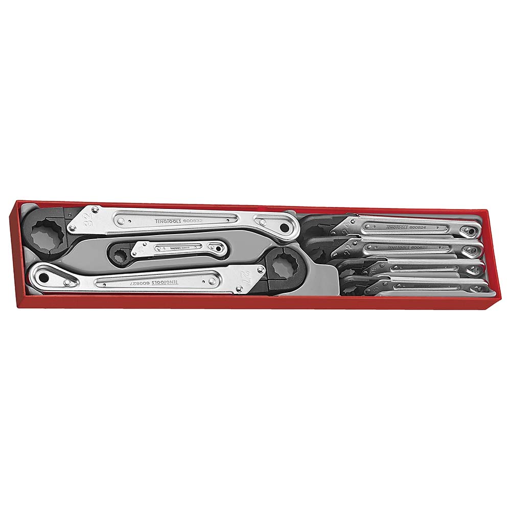 7Pc Quick Ratchet Spanner Set TTXQRS07 TC-Tray Modular System – GET ORGANISED WITH TENG! Tray Size: 560 x 110 x 70mm Tray Weight: 2.2kg Teng Tools Set of 7 quick wrenches in metric sizes. Supplied in plastic tray which fits in Teng Tools tool boxes and roller cabinets. Sizes: 13 17 19 22 24 27 32mm