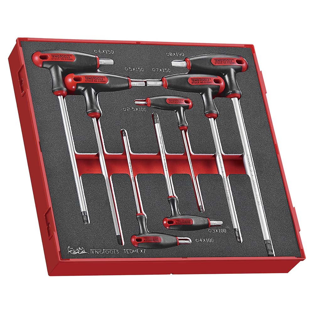 TEDHEX7 – 7pc T-Handle Hex Set 2.5-8mm – TED-Tray TC-Tray Modular System – GET ORGANISED WITH TENG! Tray Size: 265 x 285 x 50mm 7 piece hex key set in metric set. With ball point head on the long key end which permits turning even at a 30° angle. Supplied in a plastic TC tray with removable lid. Three colour EVA foam. Fits in Teng Tools tool boxes and roller cabinets. Hex Keys: 2.5 3 4 5 6 7 8mm
