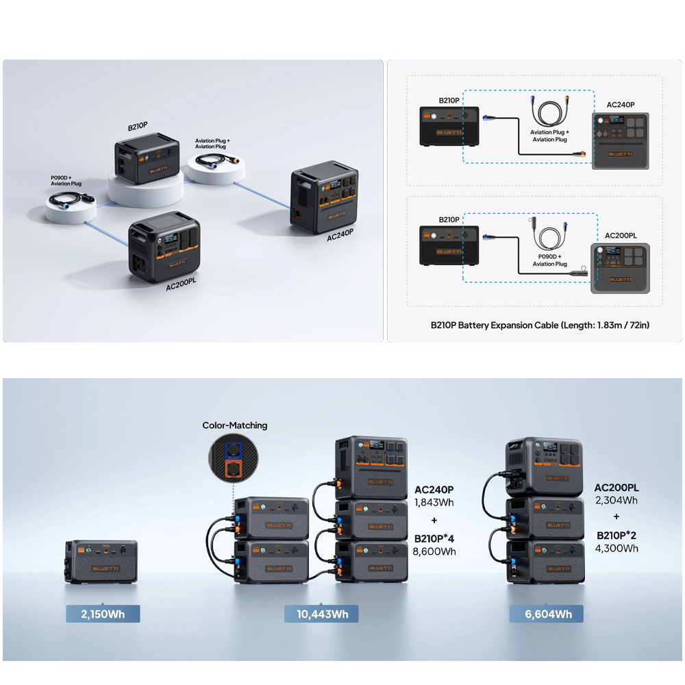 * AC240P accepts up to 4 B210P units with capacity scaled from 1,843Wh to 10,443Wh (double for parallel connection); while AC200P L accepts up to 2 units with 2,304Wh to 6,604Wh capacity.