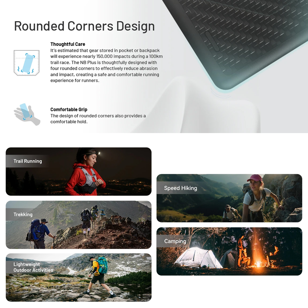 Thoughtful care: it’s estimated that gear stored in pocket or backpack will experience nearly 150,000 impacts during a 100km trail race. The NB plus is thoughtfully designed with four rounded corners to effectively reduce abrasion and impact, creating a safe and comfortable running experience for runner.