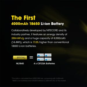 Collaboratively developed by NITECORE and its industry partner, it features an energy density of 288mWh/g and a huge capacity of 4,000mah (14.4Wh), which is 17.6% higher than conventional 18650 Li-ion batteries.