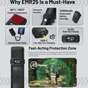 By using a 180 C efficient heating system and NITECORE professional outdoor mosquito repellent mats, the EMR25 creates a mosquito-free area in just 10 minutes.